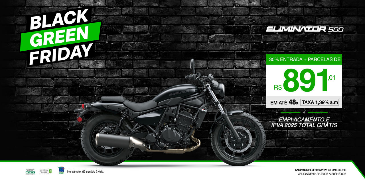 Para a entrega da motocicleta, será cobrado frete máximo no valor de R$ 1.650,00 variável de acordo com a UF, incluso (OU NÃO) na simulação de financiamento. Os valores de taxas de registro de contrato praticado em cada Estado e frete poderá alterar o valor da parcela de financiamento divulgada, devendo o consumidor consultar a concessionária mais próxima no ato da compra. O prazo de vigência da oferta é de 01/11/2025 a 30/11/2025 ou até o término dos estoques. Estoque de 10 unidades para a motocicleta marca 0KM Kawasaki modelo Eliminator 500, de ano/modelo 2025/2025.
