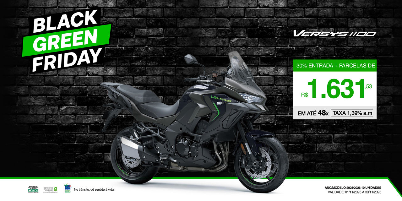 Condições para contratos de financiamento na modalidade CDC, firmados com o Santander Financiamentos (Aymoré Crédito, Financiamento e Investimento S.A.). Simulação de financiamento realizada para motocicleta 0Km Kawasaki modelo VERSYS 1100, ano/modelo 2025/2026. Preço Público Sugerido à vista de R$ 78.890,00 (frete incluso), com entrada de R$ 23.667,00 e valor financiado R$ 55.223,00, Prazo de 48 meses. Simulação: Taxa de 1,39% a.m. e 18,02% a.a., IOF R$ 215,38 incluso na parcela de R$ 1.631,53. Tarifa de Cadastro R$ 1.149,00 e Registro de Contrato (para o Estado de São Paulo) R$ 305,97 demais Estados consultar valor cobrado pelo DETRAN local, os valores estão incluídos na parcela. Custo Efetivo Total - CET de 1,51% a.m. e 19,97% a.a. Valor total financiado (com impostos): R$ 56.893,35 e valor pago total (entrada + somas das parcelas) R$ 101.980,44. Primeira Parcela em 30 dias. Para a entrega da motocicleta, será cobrado frete máximo no valor de R$ 2.800,00 variável de acordo com a UF, incluso (OU NÃO) na simulação de financiamento. Os valores de taxas de registro de contrato praticado em cada Estado e frete poderá alterar o valor da parcela de financiamento divulgada, devendo o consumidor consultar a concessionária mais próxima no ato da compra. O prazo de vigência da oferta é de 01/11/2025 a 30/11/2025 ou até o término dos estoques. Estoque de 10 unidades para a motocicleta marca 0KM Kawasaki modelo VERSYS 1100, de ano/modelo 2025/2026.