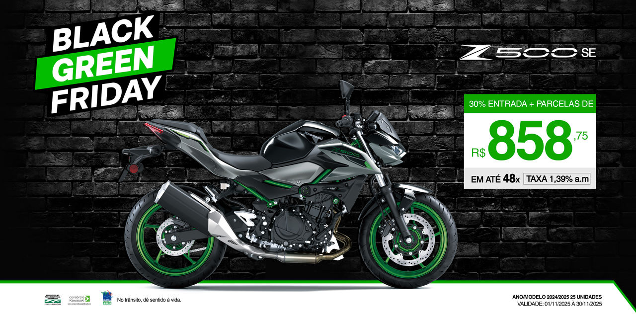 Condições para contratos de financiamento na modalidade CDC, firmados com o Santander Financiamentos (Aymoré Crédito, Financiamento e Investimento S.A.). Simulação de financiamento realizada para motocicleta 0Km Kawasaki modelo Z500 SE ano/modelo 2025/2025. Preço Público Sugerido à vista de R$ 40.520,00 (frete incluso), com entrada de R$ 12.156,00 e valor financiado R$ 28.364,00, Prazo de 48 meses. Simulação: Taxa de 1,39% a.m. e 18,02% a.a., IOF R$ 113,32 incluso na parcela de R$ 858,75. Tarifa de Cadastro R$ 1.149,00 e Registro de Contrato (para o Estado de São Paulo) R$ 305,97 demais Estados consultar valor cobrado pelo DETRAN local, os valores estão incluídos na parcela. Custo Efetivo Total - CET de 1,62% a.m. e 21,60% a.a. Valor total financiado (com impostos): R$ 29.932,29 e valor pago total (entrada + somas das parcelas) R$ 53.376,00. Primeira Parcela em 30 dias. Para a entrega da motocicleta, será cobrado frete máximo no valor de R$ 1.650,00 variável de acordo com a UF, incluso (OU NÃO) na simulação de financiamento. Os valores de taxas de registro de contrato praticado em cada Estado e frete poderá alterar o valor da parcela de financiamento divulgada, devendo o consumidor consultar a concessionária mais próxima no ato da compra. O prazo de vigência da oferta é de 01/11/2025 a 30/11/2025 ou até o término dos estoques. Estoque de 10 unidades para a motocicleta marca 0KM Kawasaki modelo Z500 SE, de ano/modelo 2025/2025.