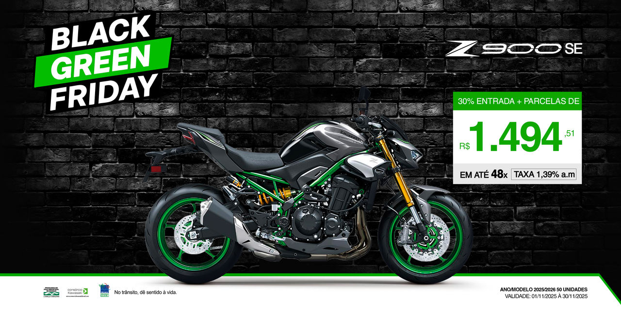 Condições para contratos de financiamento na modalidade CDC, firmados com o Santander Financiamentos (Aymoré Crédito, Financiamento e Investimento S.A.). Simulação de financiamento realizada para motocicleta 0Km Kawasaki modelo Z900 RS R EDITION, ano/modelo 2025/2025. Preço Público Sugerido à vista de R$ 76.090,00 (frete incluso), com entrada de R$ 22.827,00 e valor financiado R$ 53.263,00, Prazo de 48 meses. Simulação: Taxa de 1,39% a.m. e 18,02% a.a., IOF R$ 207,92 incluso na parcela de R$ 1.575,11. Tarifa de Cadastro R$ 1.149,00 e Registro de Contrato (para o Estado de São Paulo) R$ 305,97 demais Estados consultar valor cobrado pelo DETRAN local, os valores estão incluídos na parcela. Custo Efetivo Total - CET de 1,51% a.m. e 20,03% a.a. Valor total financiado (com impostos): R$ 54.925,89 e valor pago total (entrada + somas das parcelas) R$ 98.432,28. Primeira Parcela em 30 dias. Para a entrega da motocicleta, será cobrado frete máximo no valor de R$ 2.100,00 variável de acordo com a UF, incluso (OU NÃO) na simulação de financiamento. Os valores de taxas de registro de contrato praticado em cada Estado e frete poderá alterar o valor da parcela de financiamento divulgada, devendo o consumidor consultar a concessionária mais próxima no ato da compra. O prazo de vigência da oferta é de 01/11/2025 a 30/11/2025 ou até o término dos estoques. Estoque de 10 unidades para a motocicleta marca 0KM Kawasaki modelo Z900 RS R EDITION, de ano/modelo 2025/2025.